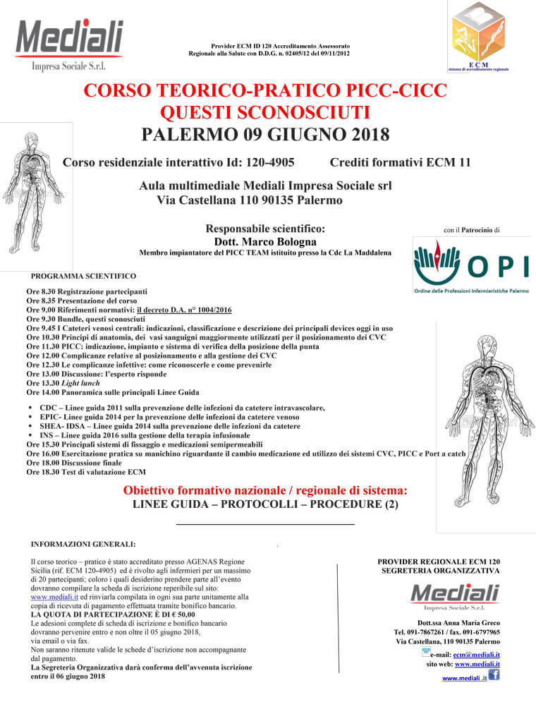 Il corso teorico – pratico è stato accreditato presso AGENAS Regione Sicilia (rif. ECM 120-4905)  ed è rivolto agli infermieri per un massimo di 20 partecipanti; coloro i quali desiderino prendere parte all’evento dovranno compilare la scheda di iscrizione reperibile sul sito: www.mediali.it ed rinviarla compilata in ogni sua parte unitamente alla copia di ricevuta di pagamento effettuata tramite bonifico bancario.